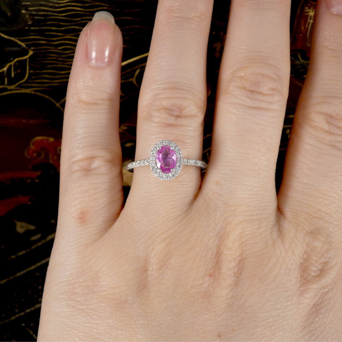 Romantic and refined, this Pink Sapphire and Diamond cluster ring is beautifully crafted in enduring platinum. At the centre sits a vibrant pink sapphire weighing 0.70ct, it has a lively colour that is enhanced by a surrounding halo of brilliant cut diamonds, adding soft sparkle and a classic cluster finish. The design continues with diamond set shoulders, offering extra brilliance and a seamless flow of light across the finger. This ring is crafted in a wedfit style, allowing a wedding band to sit neatly alongside it, making it an ideal choice for an engagement ring or meaningful right hand ring. A timeless blend of colour and elegance, perfect for those who love a modern twist on a classic cluster design.